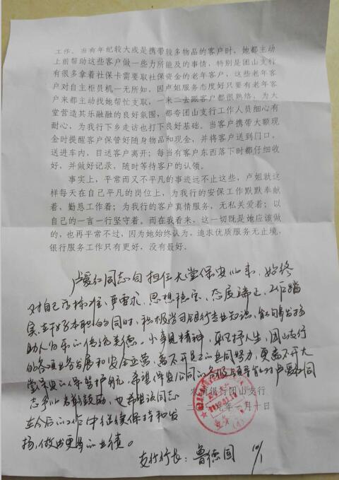 在客流量較多時地能主動鋪助大堂經(jīng)理完成客戶的分流和引導工作,當有年紀較大或是攜帶較多物品的客戶時,她都主動上前幫助這些客戶做一些力所能及的事情,特別是團山有很多拿著社保卡需要取社保資金的老年客戶,這些老年客戶對自主柜員機一無所知,因盧姐服務態(tài)度好只要有老年客戶來都主動找她幫忙支取,一米二去跟吝戶都很熟絡,為大堂營造其樂融融的良好氛圍,都夸團山支行工作人員細心有耐心,為我行下鄉(xiāng)走訪也打下良好基礎。當客戶攜帶大額現(xiàn)金時提醒客戶保管好隨身物品和現(xiàn)金、并將客戶送到門口送進車內(nèi),日送客戶離開;每當有客戶東西落下時都仔細收好,并做好記錄,隨時等待客戶的認領